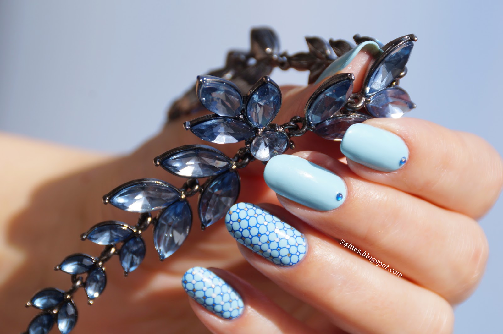 Dzisiaj kolejna porcja geometrii na paznokciach :) Bazą zdobienia jest klasyczny kremowy błękit Color Club "Take me to your chateau". Motyw z płytki Uber Chic 1-03 odbity granatowym lakierem do stempli Born Pretty Store. Dodatkowo białym i złotym lakierem zrobione symetrycznie kropki.