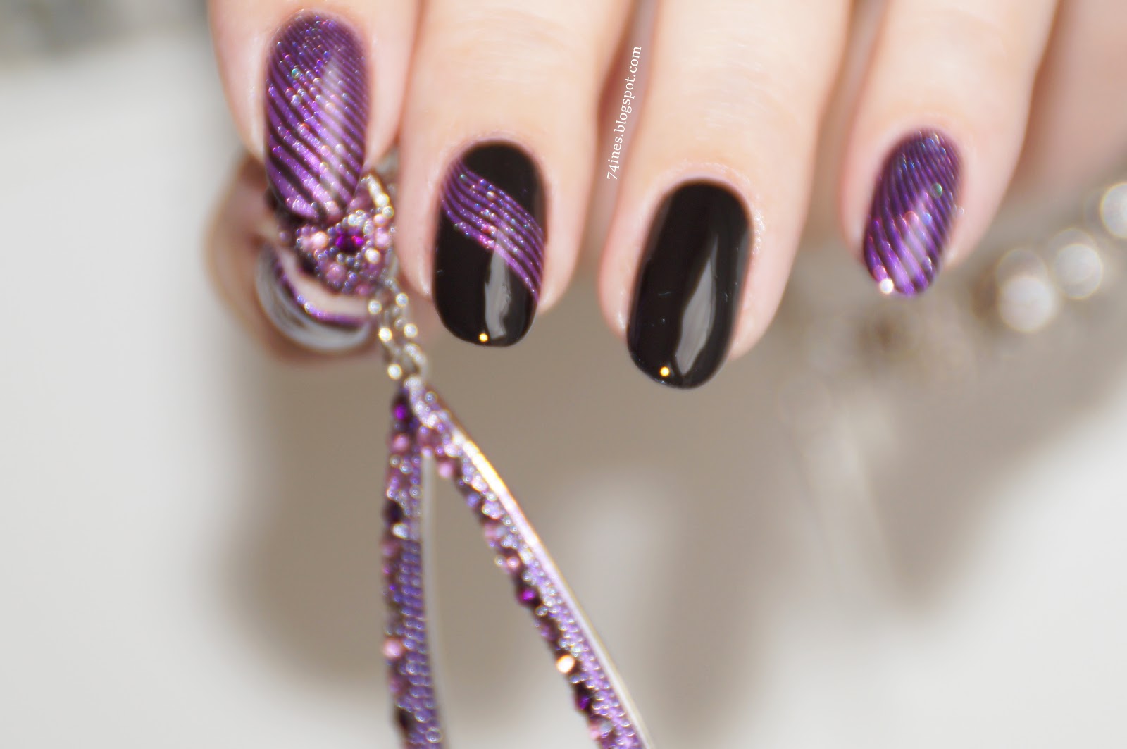 Fiolet i czerń to jedno z moich ulubionych zestawień kolorystycznych. W dzisiejszym mani bazą jest fioletowy AMETHYST El Corazon który uzupełniłam motywem z płytki Uber Chic 1-01. Delikatne paseczki odbiłam czarnym Konadem i na środkowym paznokciu część wzoru zamalowałam moim ulubionym czarnym lakierem Sophin. Podoba się Wam takie zdobienie ?